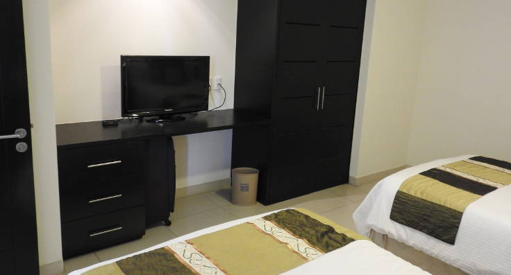 3 Bedroom Residence Suites - Includes a full kitchen with stainless steel appliances and granite countertops, Master bedroom with one King size bed and ensuite full bathroom with walk-in shower and bathtub, 2nd bedroom with one King size bed and ensuite bathroom with walk-in shower, 3rd bedroom with 2x Double beds and ensuite bathroom with walk-in shower, bathroom with walk-in shower in common area of the Suite, washer & dryer, dining area, convertible sofa in the living room and spacious balcony. This configuration sleeps 8 guests comfortably in 2691 square feet.