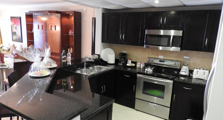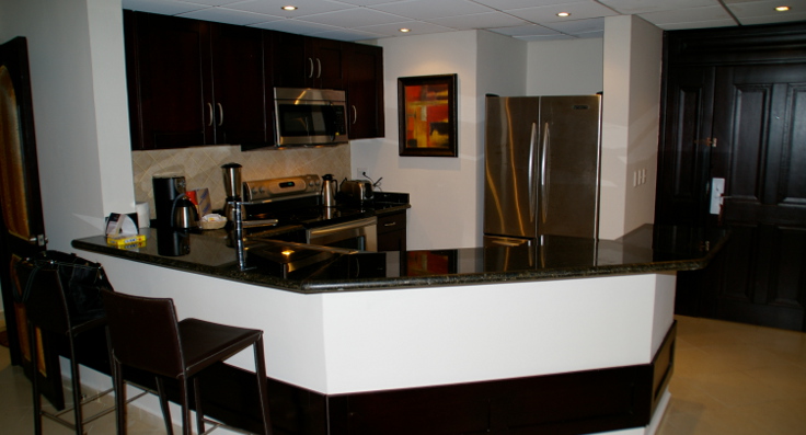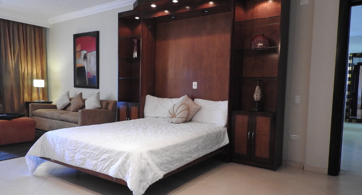 2 Bedroom Presidential Suites - Include Kitchen, 2 bedrooms, one of these rooms has a King size bed and bathroom with Jacuzzi tub and separate shower, the other, two Queen size beds with Jacuzzi tub and separate shower, and a Queen size Murphy bed contained in the large living area with private bathroom with Jacuzzi tub/shower. This configuration has a maximum occupancy of 8 guests.