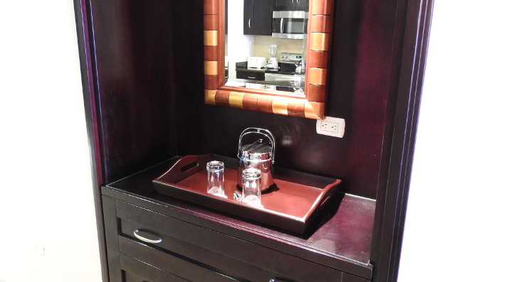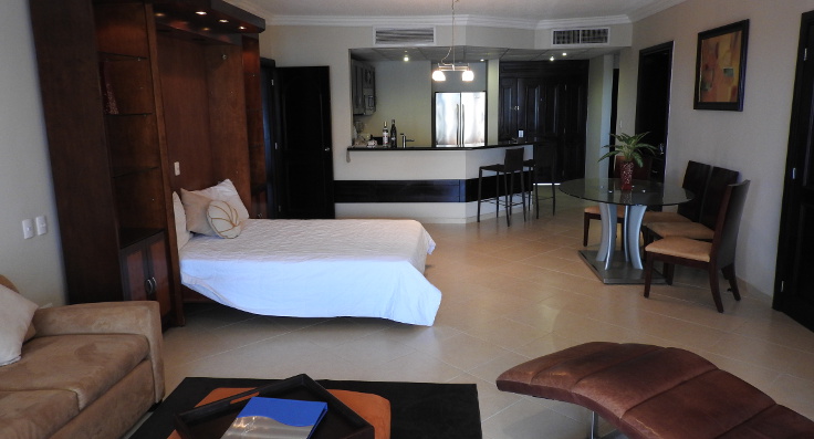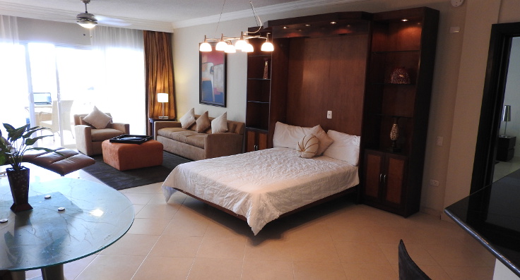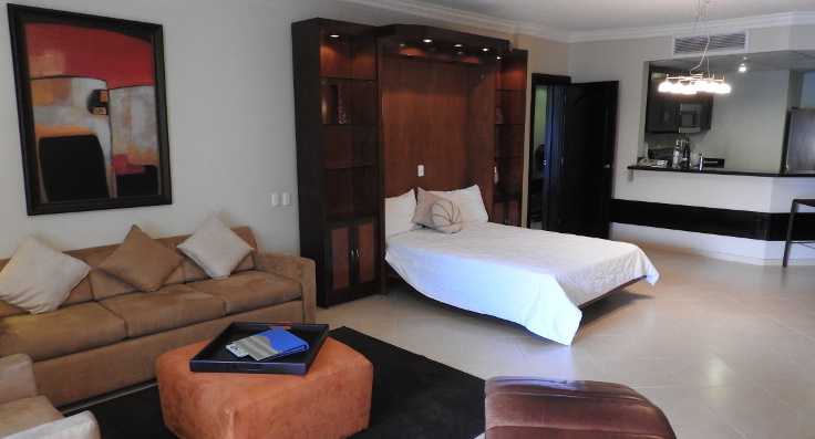 Studio Presidential Suites - Include your choice of the main living area with Kitchen and a Queen size Murphy bed with private bathroom, or 1 bedroom with one King size bed, or 1 bedroom with two Queen size beds. Each room has a bathroom with Jacuzzi tub and separate shower. This configuration has a maximum occupancy of 4 guests.